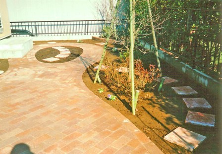 ![]() レンガを仕切る柔らかい曲線の向こうは、洗い出し仕上げ。狭い場所ながら質の高い空間になっている。 |
