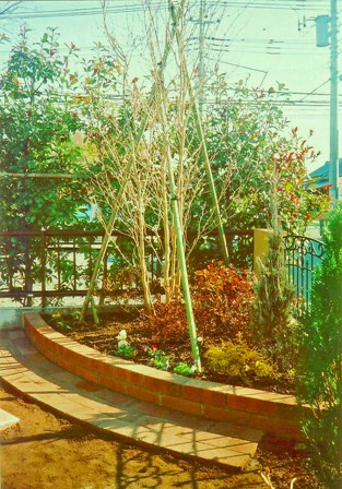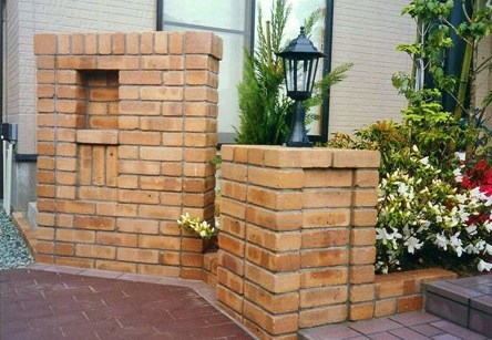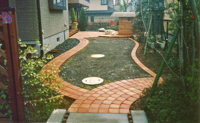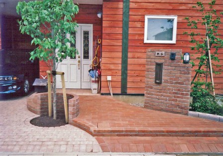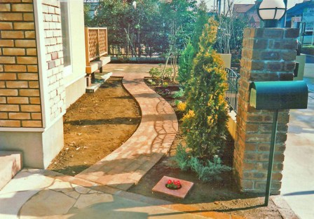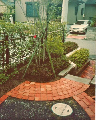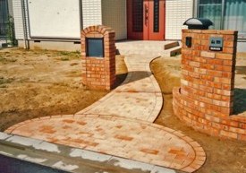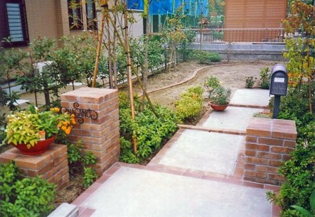 ![]() アプローチと門柱はレンガづくり。すべて曲線に。 |