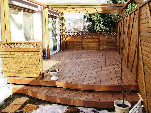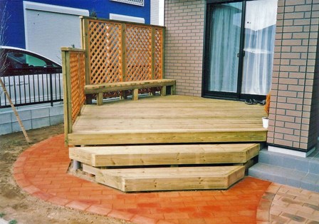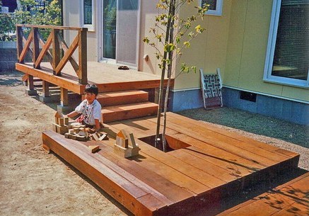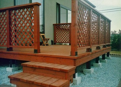 ![]() テラスに囲まれたウッドデッキ。色塗りはこれからご主人が。 |