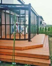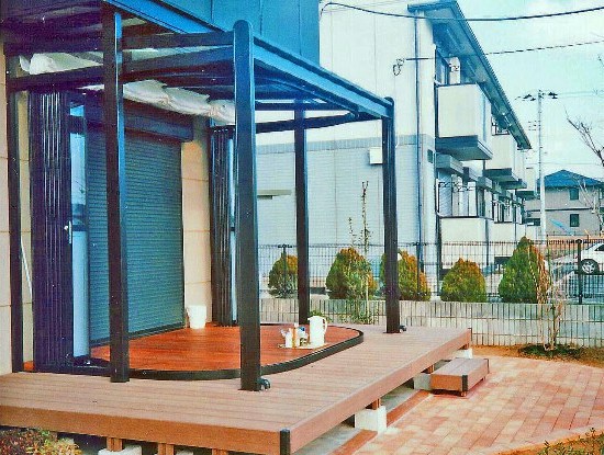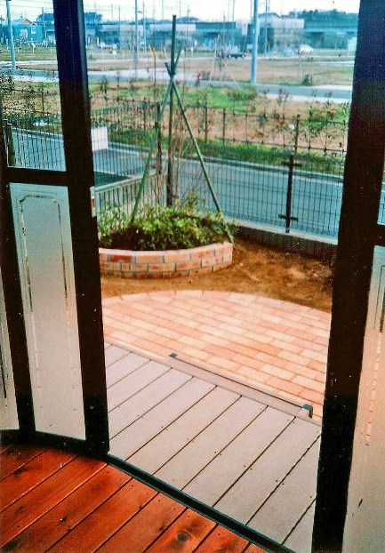 ![]() 内側からの景色。 手前から、本当の木材、人工木材、レンガテラスの組み合わせ。 窓パネルの下半分は、すりガラス調でプライバシーに配慮。 |