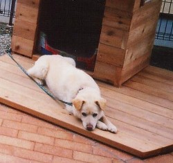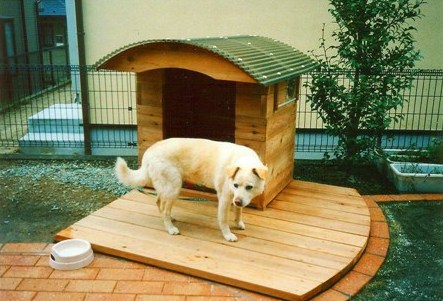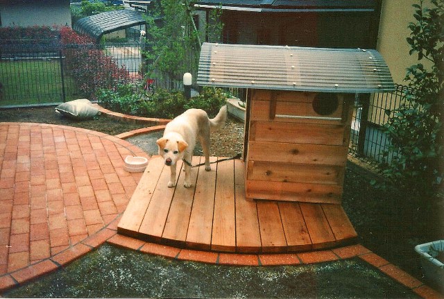 犬小屋は厚い板を交互に組み合わせて製作。丸い覗き窓は換気口でもある。デッキの下は、砂利を敷き、プラスチック土台を据え付けているので、木が長持ち。![]() |