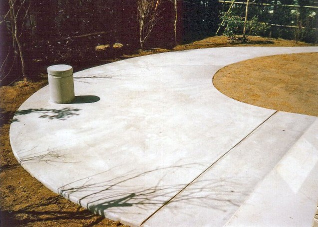 静寂をたたえるグレーの庭。 現代の素材を用いて侘びの表現を目指した。 コンクリートの造形の可能性を追求しためずらしい作品。 施工には左官職人の助力を得た。 |