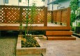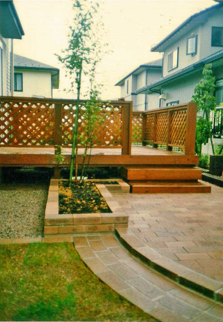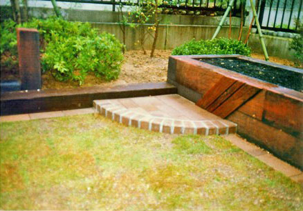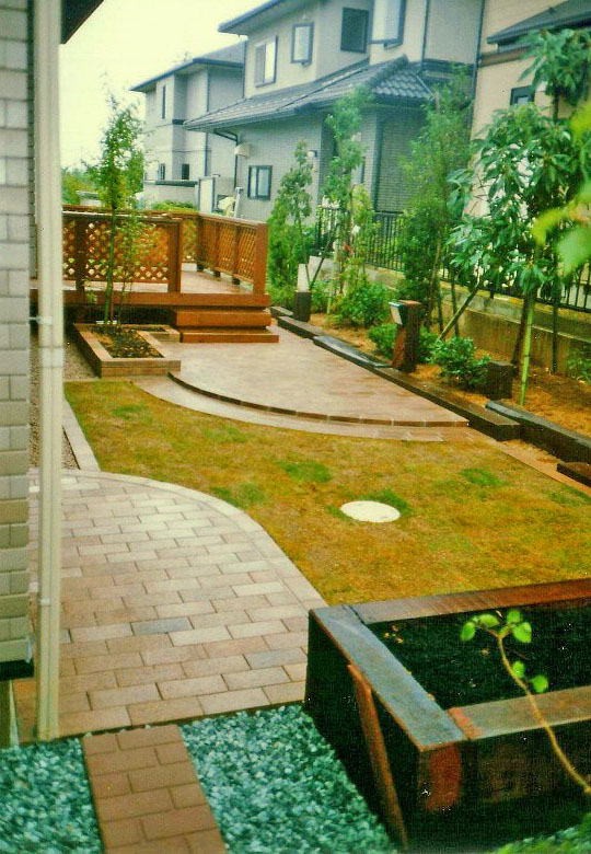 デッキの階段下に、大きめのテラス、その対角線上に中くらいのテラスが位置している。 その間に、芝生がフレーム取りされ、楽しい空間を構成。 ![]() テラスに段差が付けられ、花壇や枕木と相まって、空間を立体的に表現した。 |