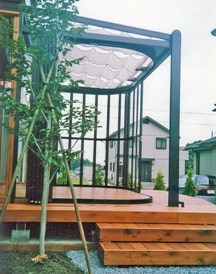 ![]() 角度を付けたウッドデッキとサークルテラスの関係。 |