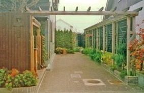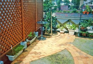 ![]() 右の小さな円は、小コーナー。 上に三角のパーゴラを配置して、フェンスで目隠しをした。 |