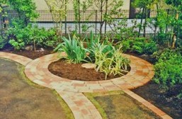 ← 円形花壇に寄り添うストーンベンチも 曲線を描く。 ↓ レンガワークのディテール。細部も大事に。 |