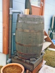 ![]() ウイスキー樽を再利用した雨水タンク。 |
