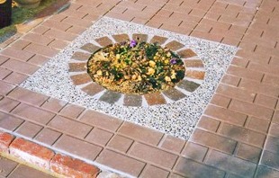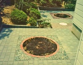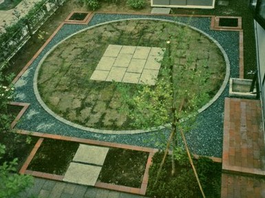 ![]() 緑が一層映える何もないスペース。 ![]() 小円に納められた砂利下には、排水のための装置が。 |