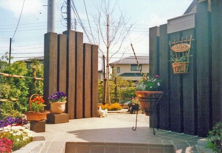 ![]() 枕木門柱からウッドフェンスへの流れ。玄関前のオリジナルな表現。 |